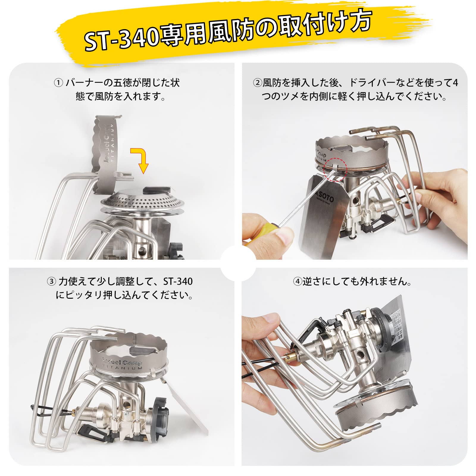 【➤設置簡単】①バーナーの五徳が閉じた状態で風防を入れます。②装着後に、爪を4箇所とも内側に軽く押し込みました。③力使えて少し調整して、ST-340にピッタリ押し込んてください。