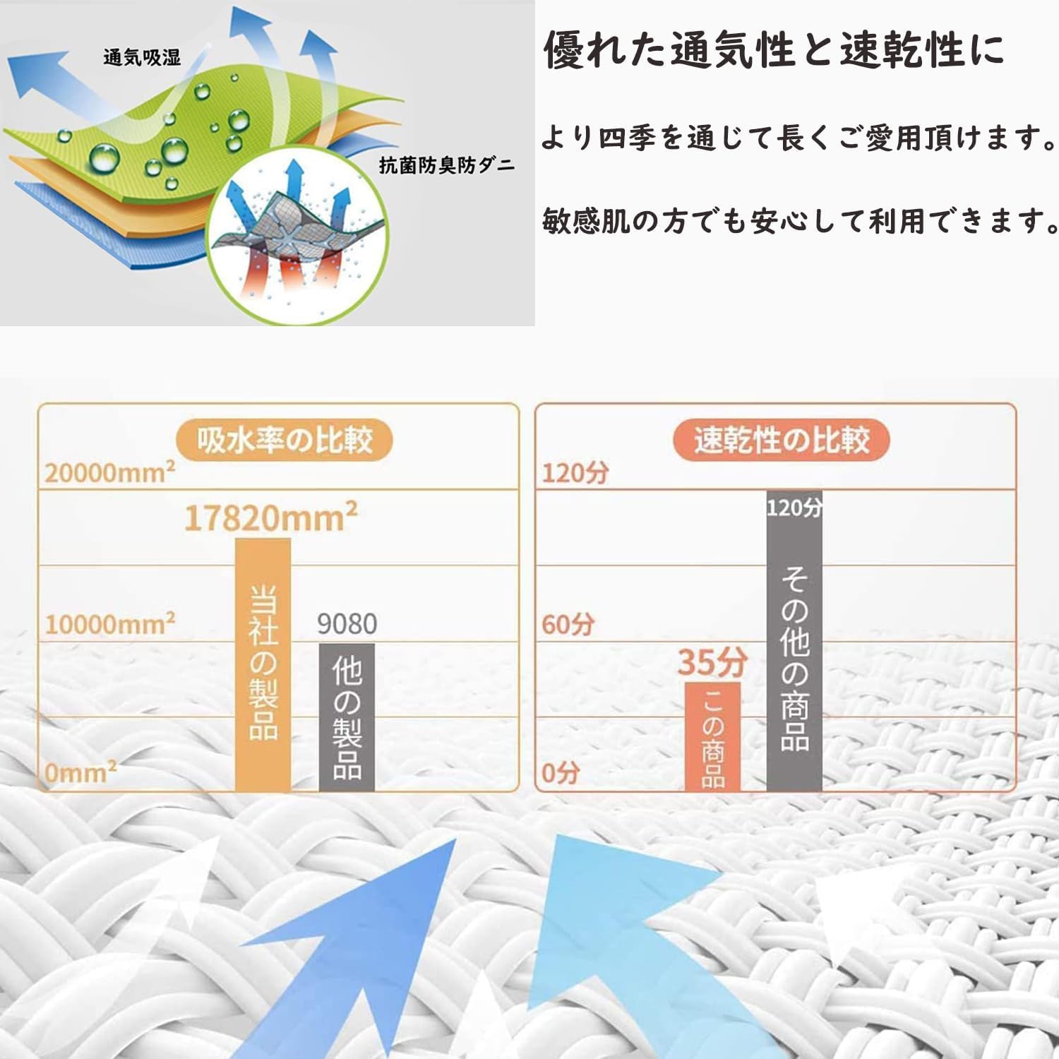 【優れた通気性&速乾性】:優れた通気性と速乾性により四季を通じて長くご愛用頂けます。暑い夏の日でも湿気を素早く吸収して発散し、サラッとした肌触りを保ってくれます。さらに抜群の速乾性により湿気による細菌などの増殖を抑えることができます。