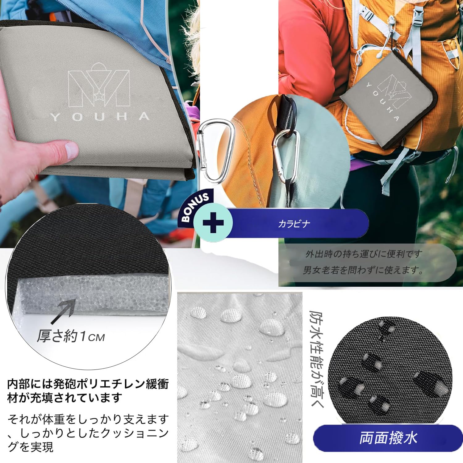 【折り畳み・軽量・持ち運びラクラク】携帯座布団は折り目に沿って折りたたむだけでコンパクトに収納できます! 折りたたんでマジックテープでさっと固定!本体にループ付きで付属のカラビナを使って、バッグに引っ掛けておくことができ便利です.軽量な仕様になっているので、常にバッグに入れていても負担なし。また、片手に収まるサイズ感でリュックの中の場所も取りません。外出時の持ち運びに便利です、男女老若を問わずに使えます