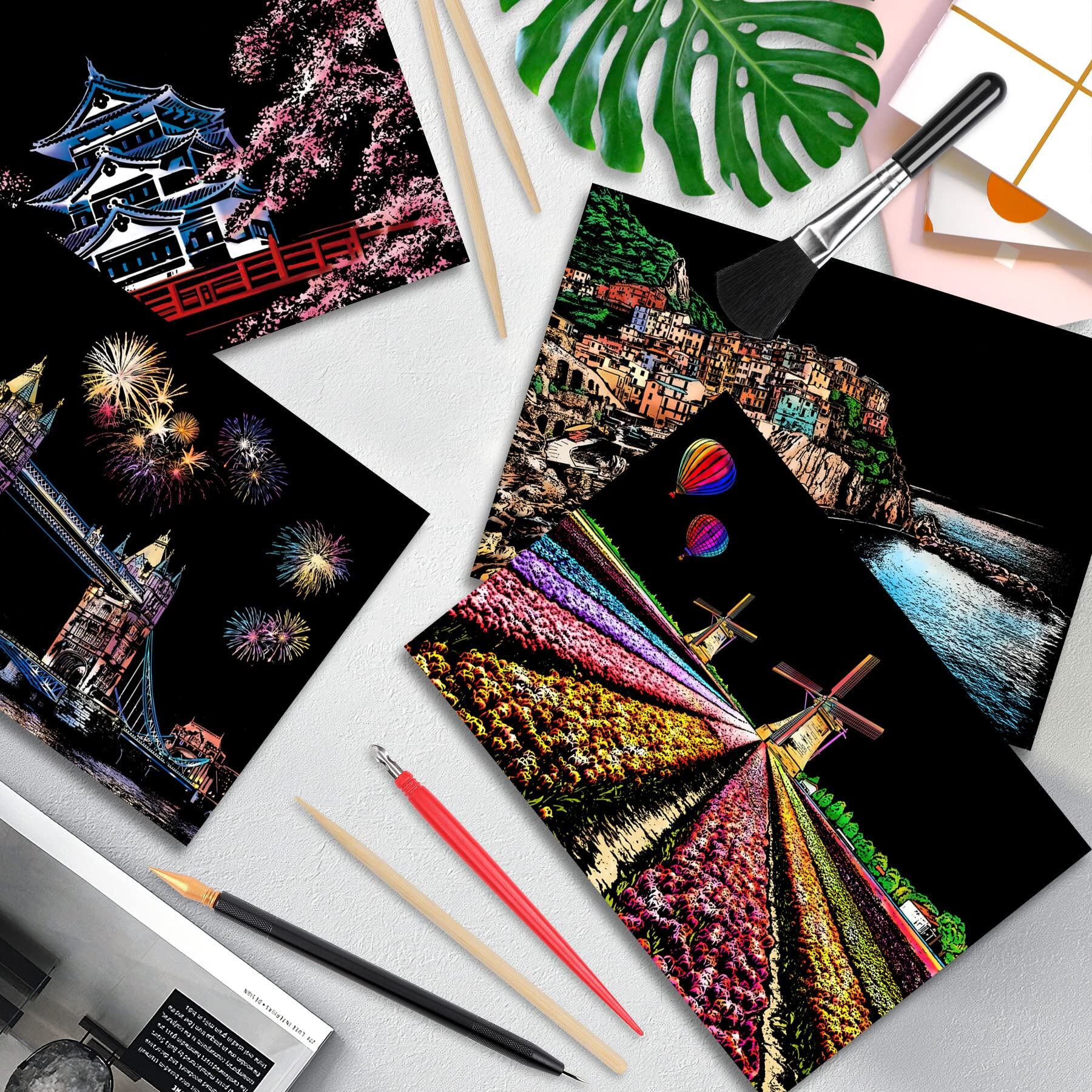JANLOFO 12枚セット スクラッチアート 大人 スクラッチペーパー A4サイズ スクラッチアートペン付き 手作り プレゼント 部屋飾り 都市と桜