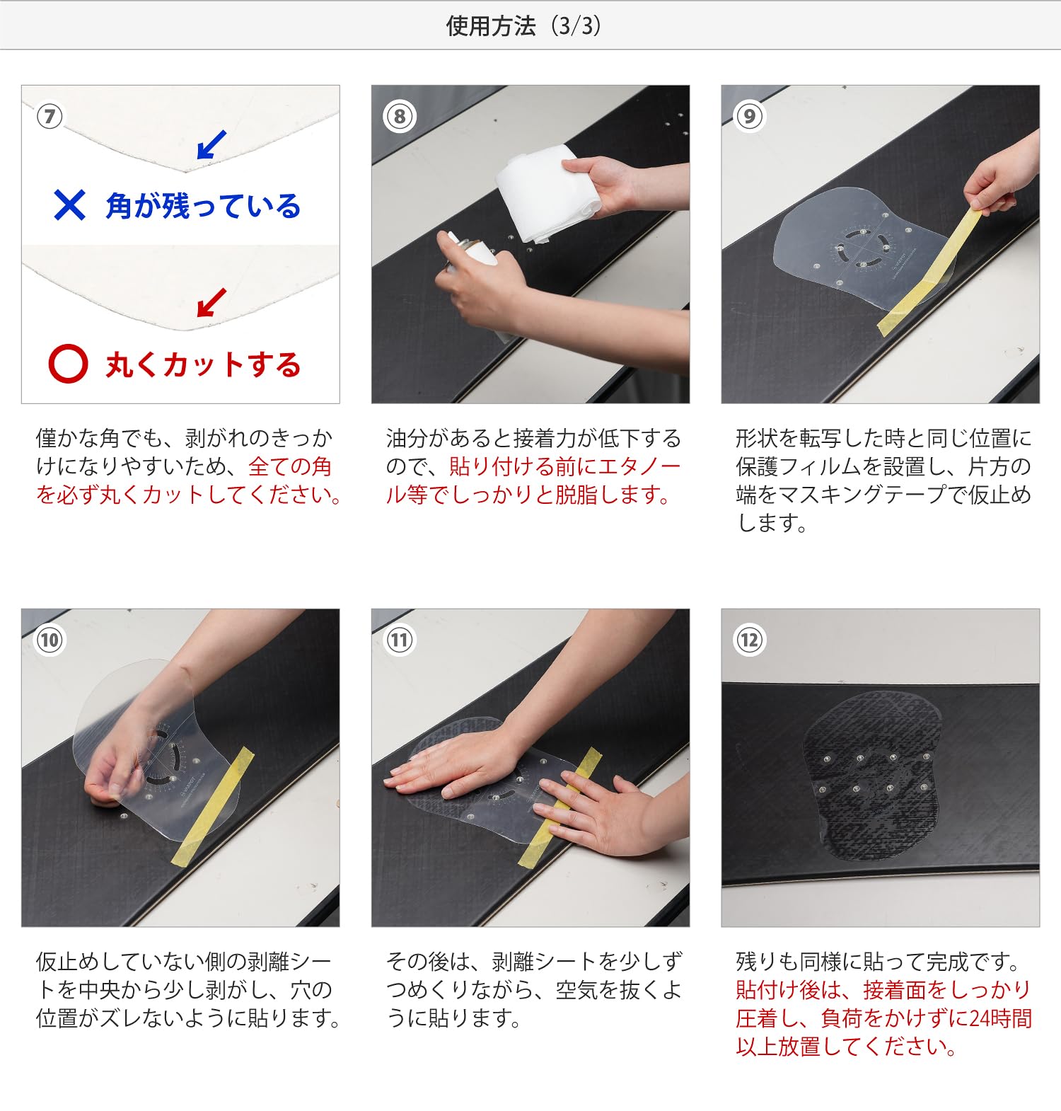 ビンディング取付時に発生する傷つきから、スノーボード表面を保護するスノーボードプロテクションフィルム。