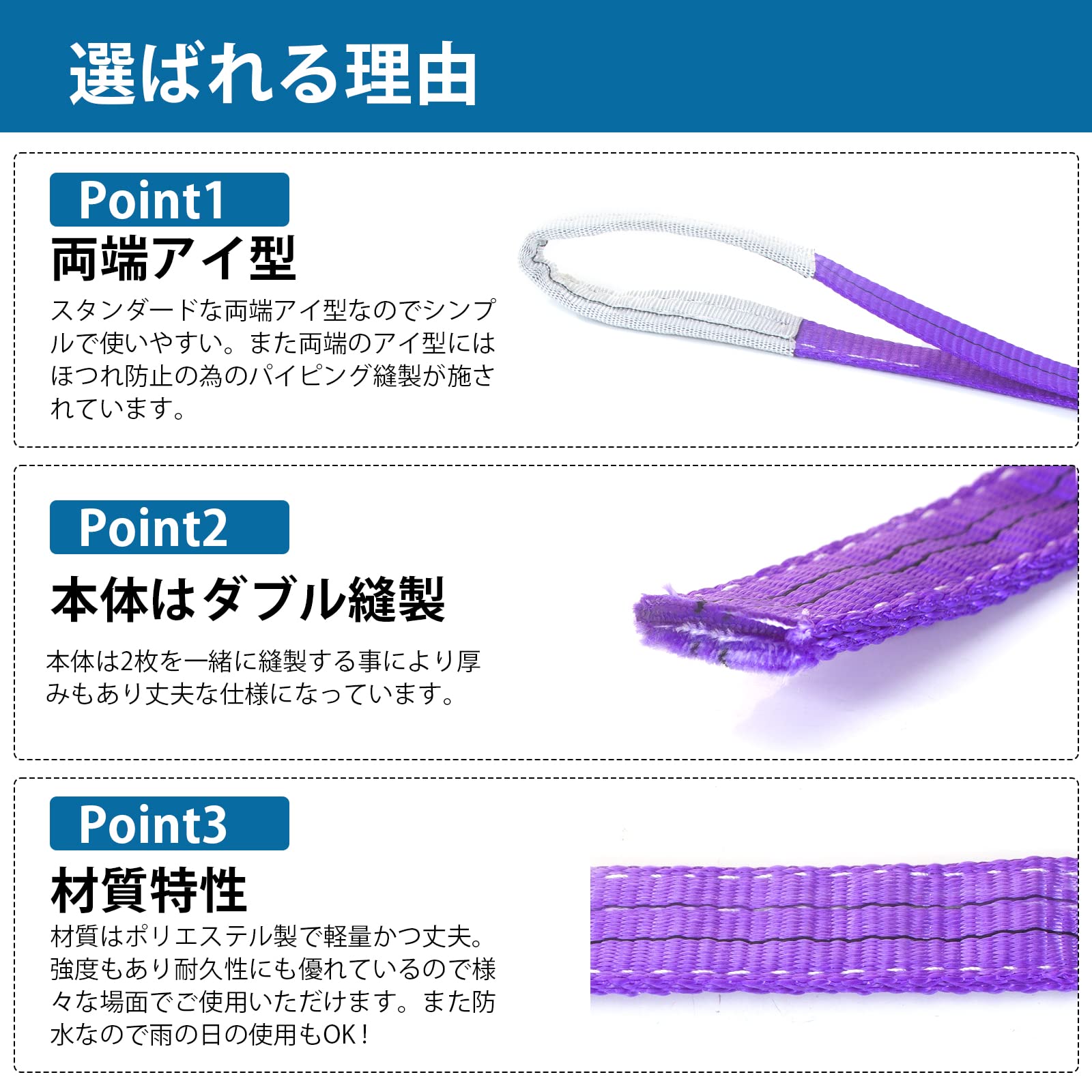 【商品仕様】■全長:2M ■ベルト幅:30mm ■紫 最大使用荷重:1000kg (ストレート吊の場合) ■安全係数:7