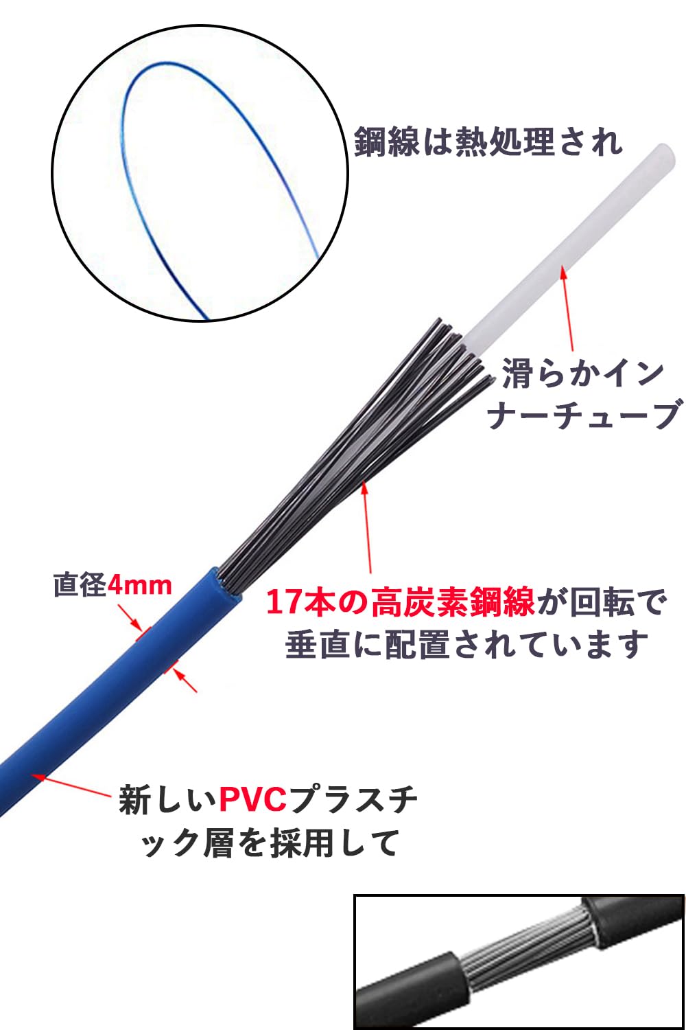 【高炭素鋼線】ケーブルの内は、17本の高炭素鋼線が回転で垂直に配置されています、変形することなく高張力に耐えることができ。鋼線は熱処理され、強度がより高く、靭性がより強い。