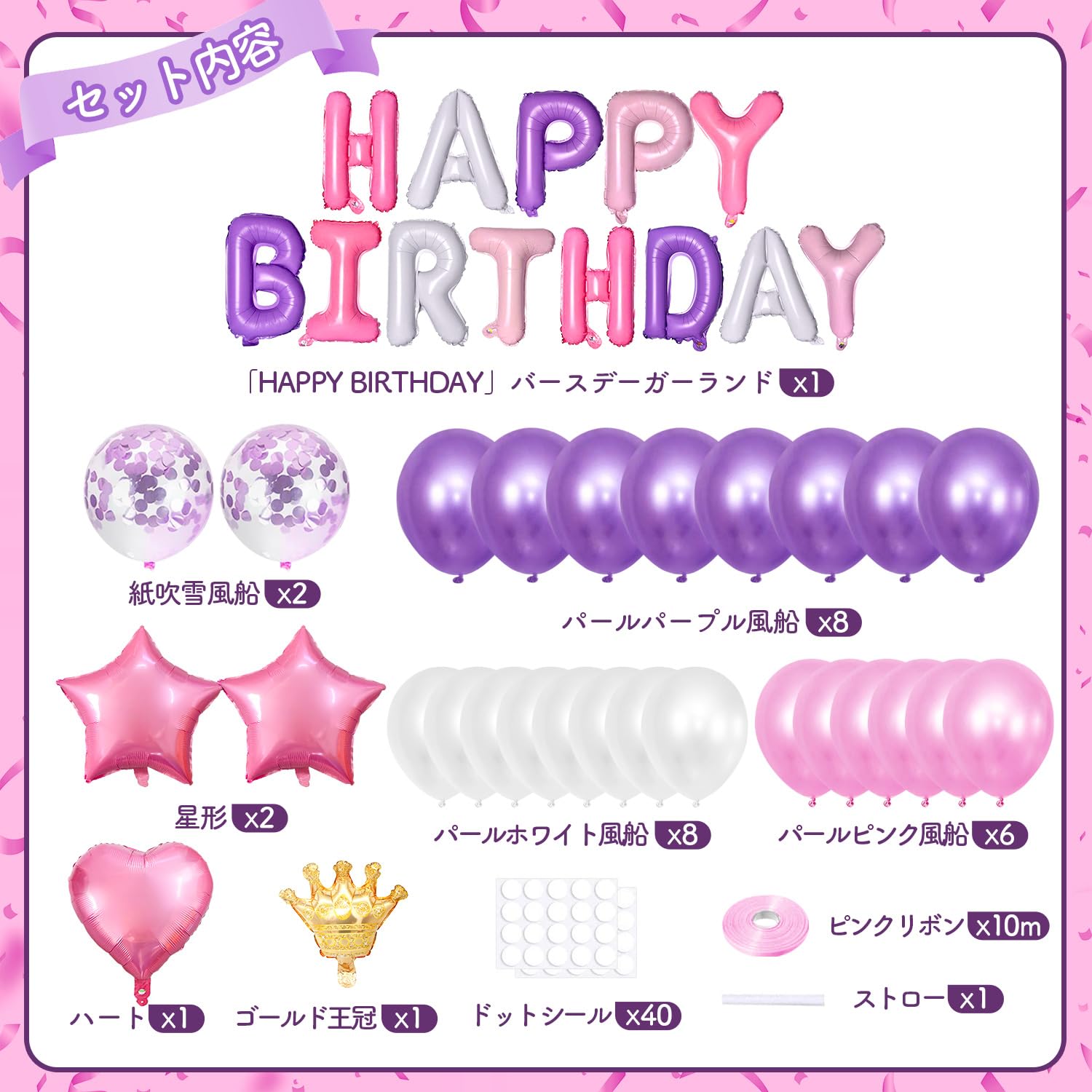 豊富な飾りセット ①「HAPPY BIRTHDAY」誕生日風船ガーランド×1 ②ゴールド王冠バルーン×1 ③パープル風船×8個 ④パールホワイトの風船×8個 ⑤ピンクの風船x6個 ⑥紙吹雪風船×2個 ⑦星形アルミバルーン×2個 ⑧ハートアルミバルーン×1個 ⑨ピンクのリボン×10m ⑩ドットシール×40点 ⑪吸込管×1本