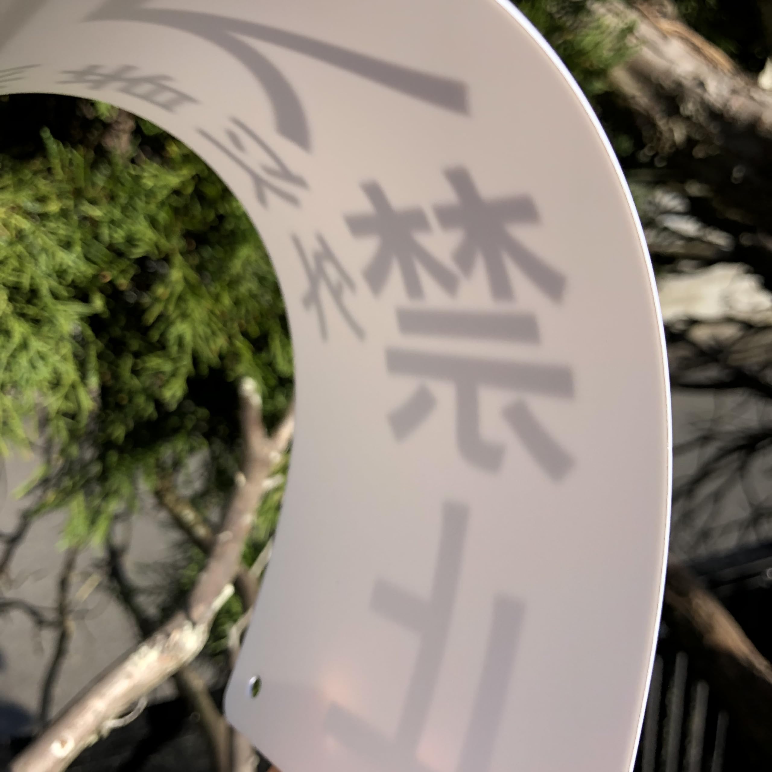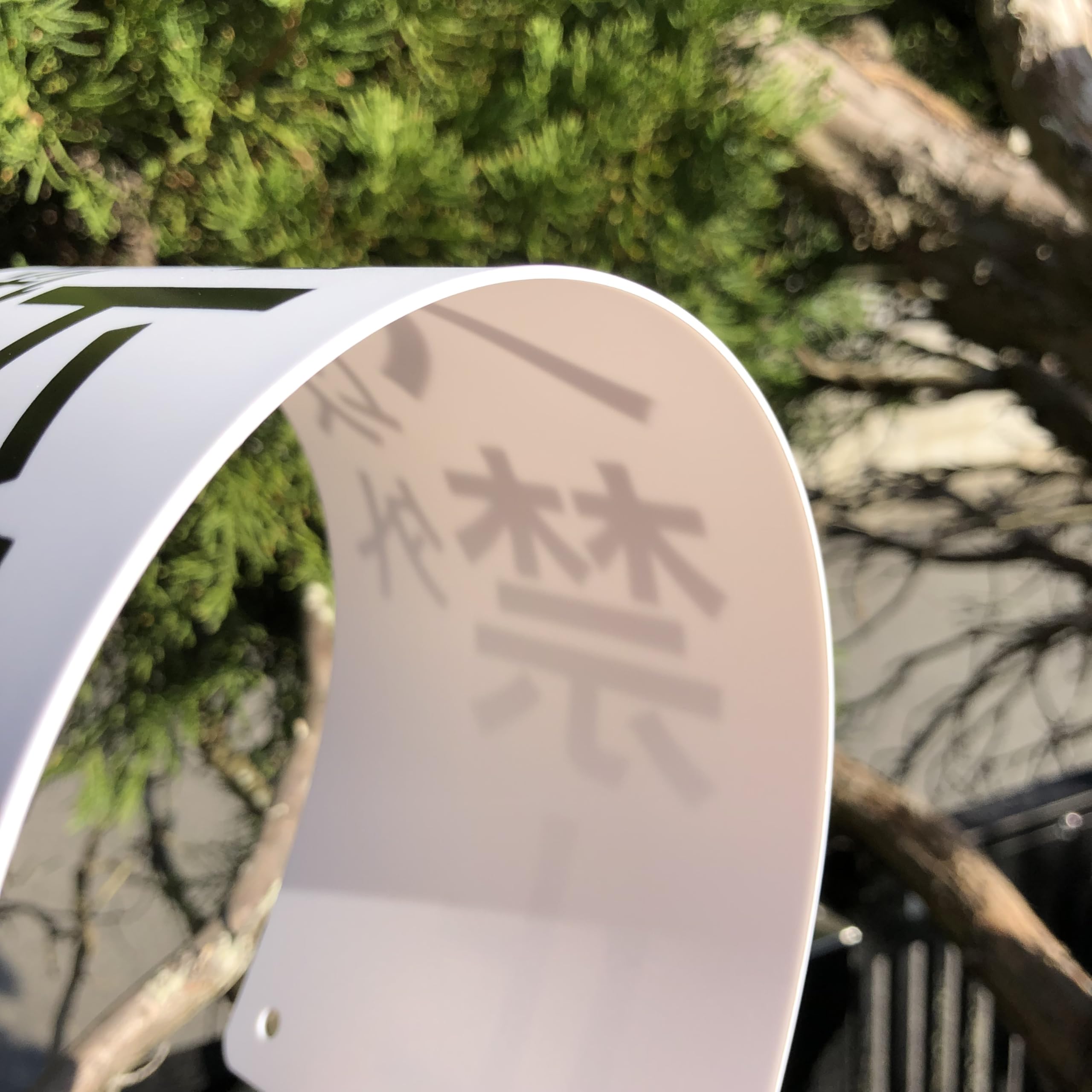 素材:PP(ポリプロピレン)樹脂板 (屋外対応) で曲げにも強く、電柱のような円柱の曲面にも取り付けが可能です。 防水仕様、耐候性に優れたポリプロピレン製の看板です。