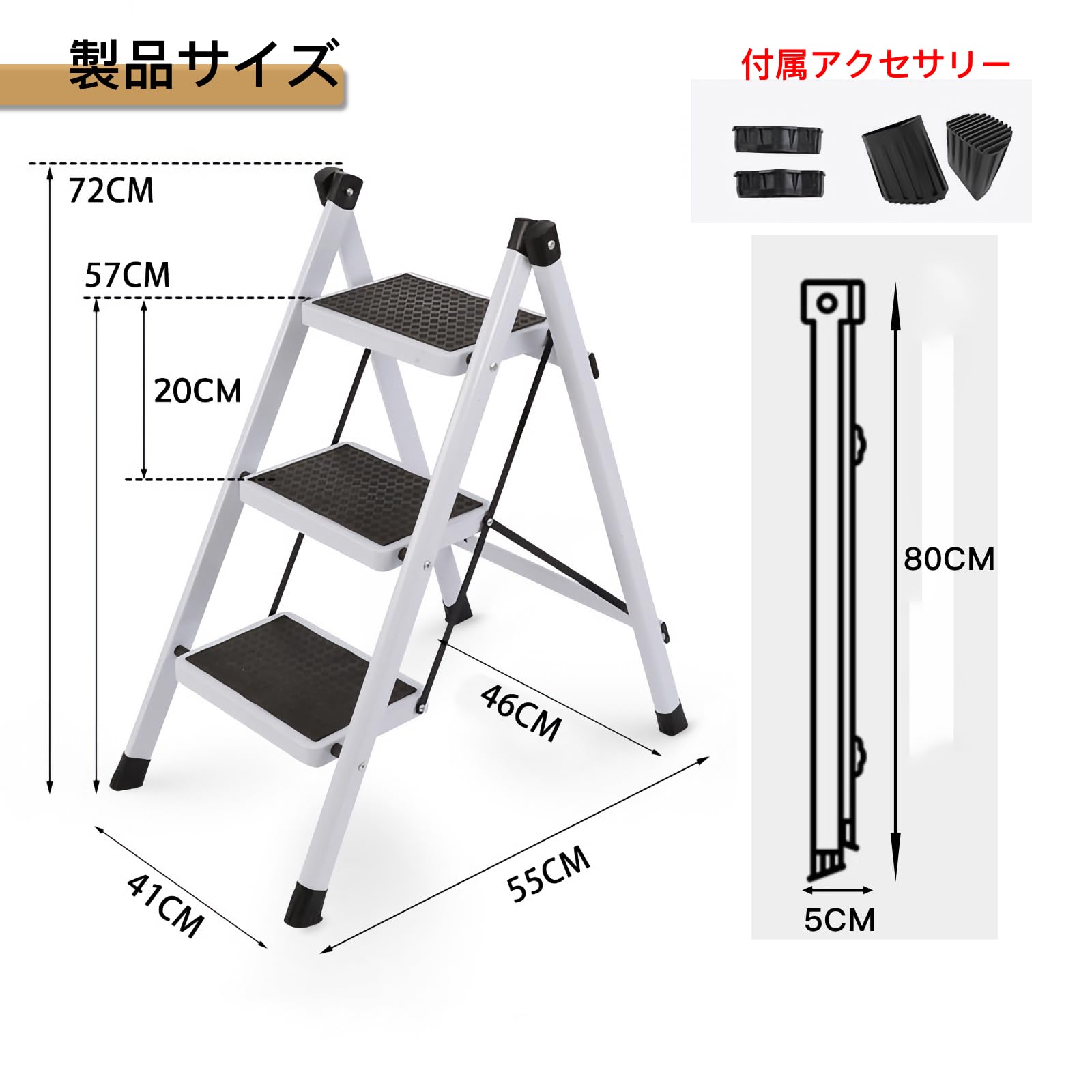 【品質素材】 脚立 3段はしごは耐久性のある炭素鋼で作られています。 丈夫で傷つきにくく、長くお使いいただけます。最大使用荷重は150kg。軽量で女性や高齢者でも持ち運びが簡単です。