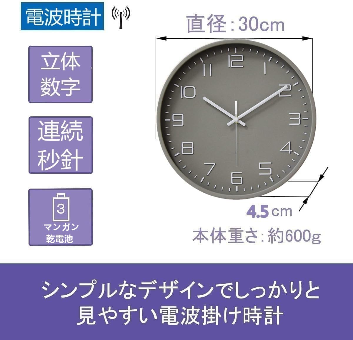 機能 : 秒針の音がコチコチならない静かな連続秒針を採用・時刻を自動で修正する電波時計・立体文字