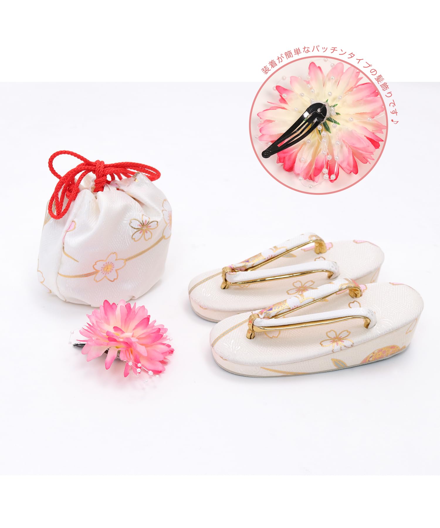 髪飾りや巾着、草履など含めて9点のフルセットなので、これだけで必要なものがすべて揃います。はじめての方でも簡単にできる着付けの説明書をお付けいたします。