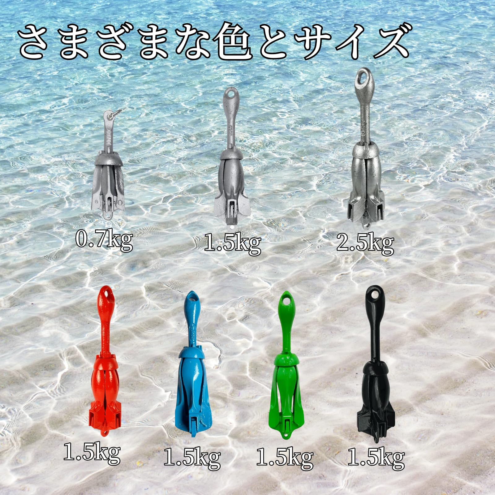 【アンカー 海 - 選べる豊富なサイズ】 当店の折りたたみりたみアンカーは、0.7kg、1.5kg、2.5kgの三つのサイズをご目的としています。お客様の目的や船のサイズに合わせてお選びいただけます。 0.7kg:浅い湖(1~3メートル)カヤック、カヌー、小型ゴムボートなどに適しています。 1.5kg:中深海(約3~7メートル)フィッシングボート、小型のレジャーボート、ポンツーンボートなどに適しています。 2.5kg:深海および大きな湖(約7~15メートル)大きなレクリエーションボート、中型のヨット、より重いフィッシングボートなどですなどに適しています。