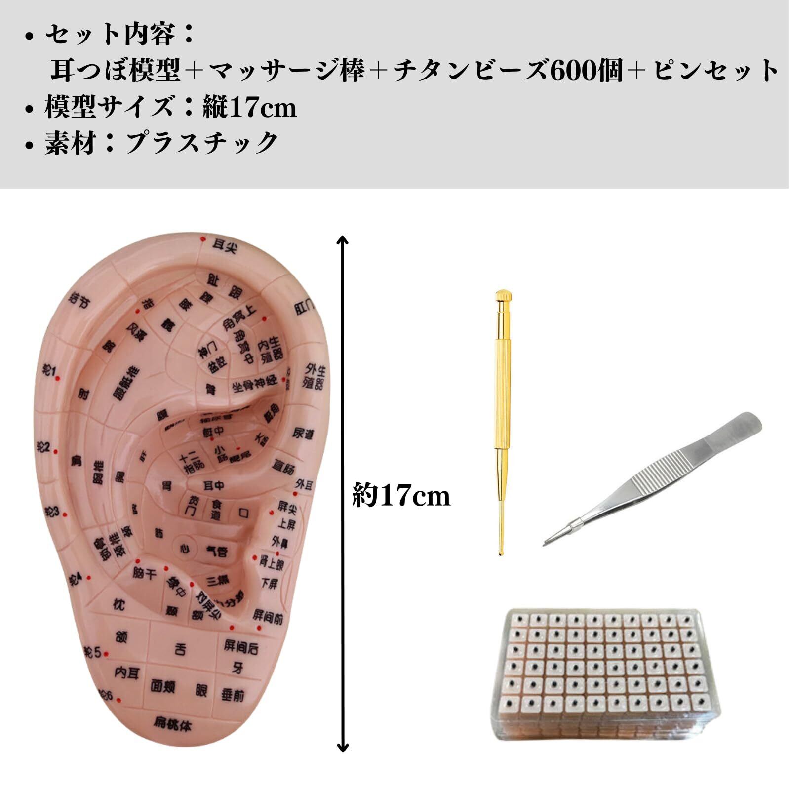 ●セット内容:耳つぼ模型・マッサージ用銅棒・チタンビーズ600個・ピンセット ●模型サイズ:縦17cm ●素材プラスティック