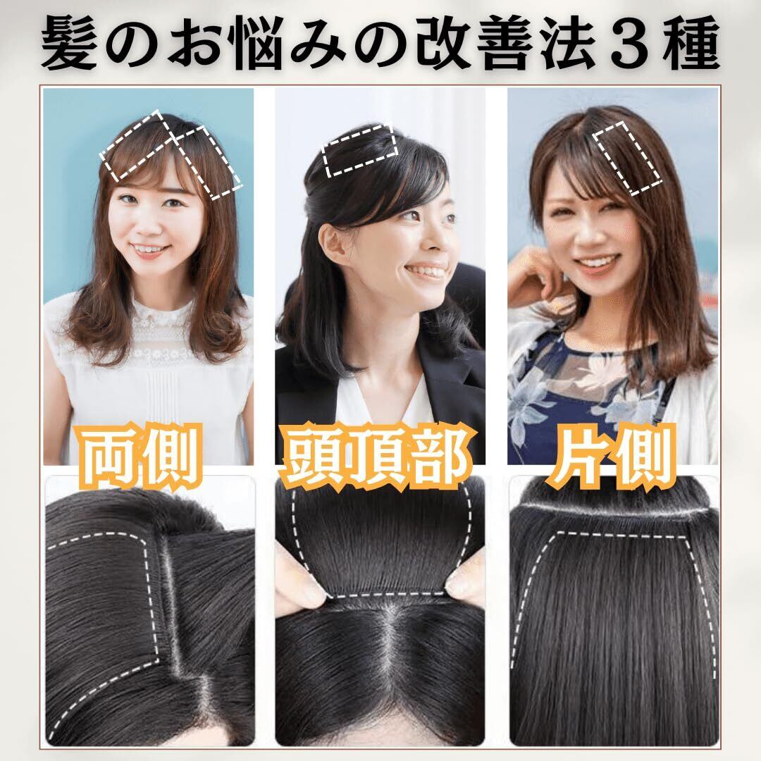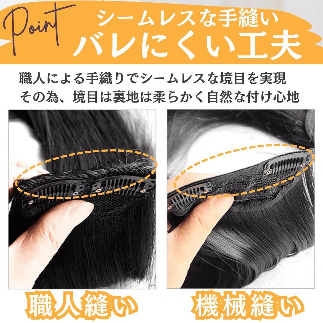 【3つの特徴】⑥特徴:【手織りステルス加工】はシームレスな境目を実現した技術で、境目まで髪に覆われている為バレにくいです。【ガッチリ固定】3個の固定ピンにより強固な固定が実現。【2cmの産毛】産毛を下地に入れることでよりナチュラルなふんわり感を再現しました。