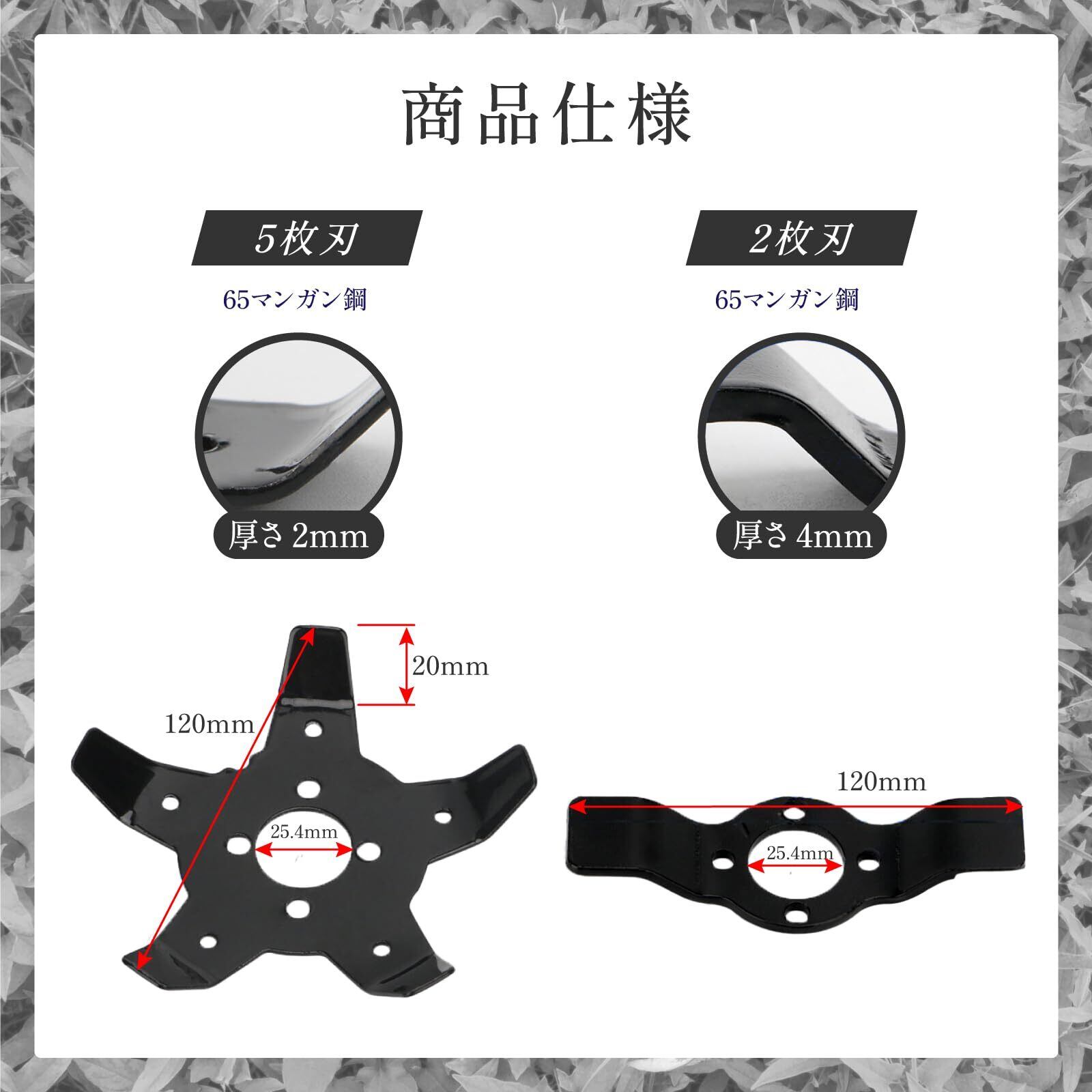 5枚刃ブレードは水田用で、水草を簡単に刈り取りできます。2枚刃ブレードは陸田用で、陸地の雑草を効果的に処理します。