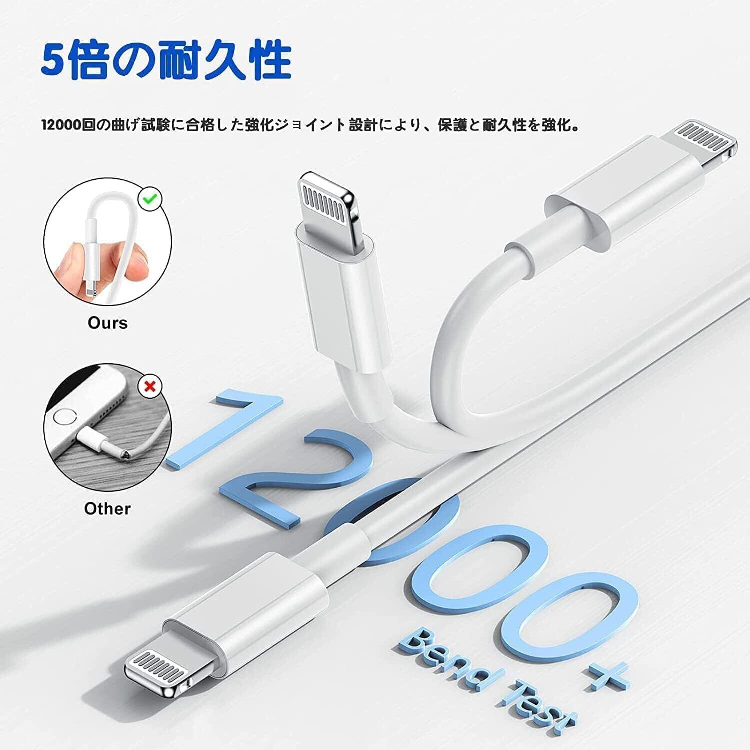 【強靭性・断線防止】本iphone充電器ケーブルは耐久性を向上させ、ライトニングおよびUSB側先端に保護層を追加して、10000回以上の折り曲げ、引き、スイング 多重テスト、内部の無酸素銅、アルミ箔なども劣化しづらく耐磨耗性にも抜群で、コネクタの根元部分も耐久性に優れた造りで、断線しにくい丈夫なつくりです。それだけでなく、外装に強靭性と柔軟性を両立したTPE素材を取り扱って、最高の高耐久を実現できます、ケーブルの寿命は効果的に延長されます。