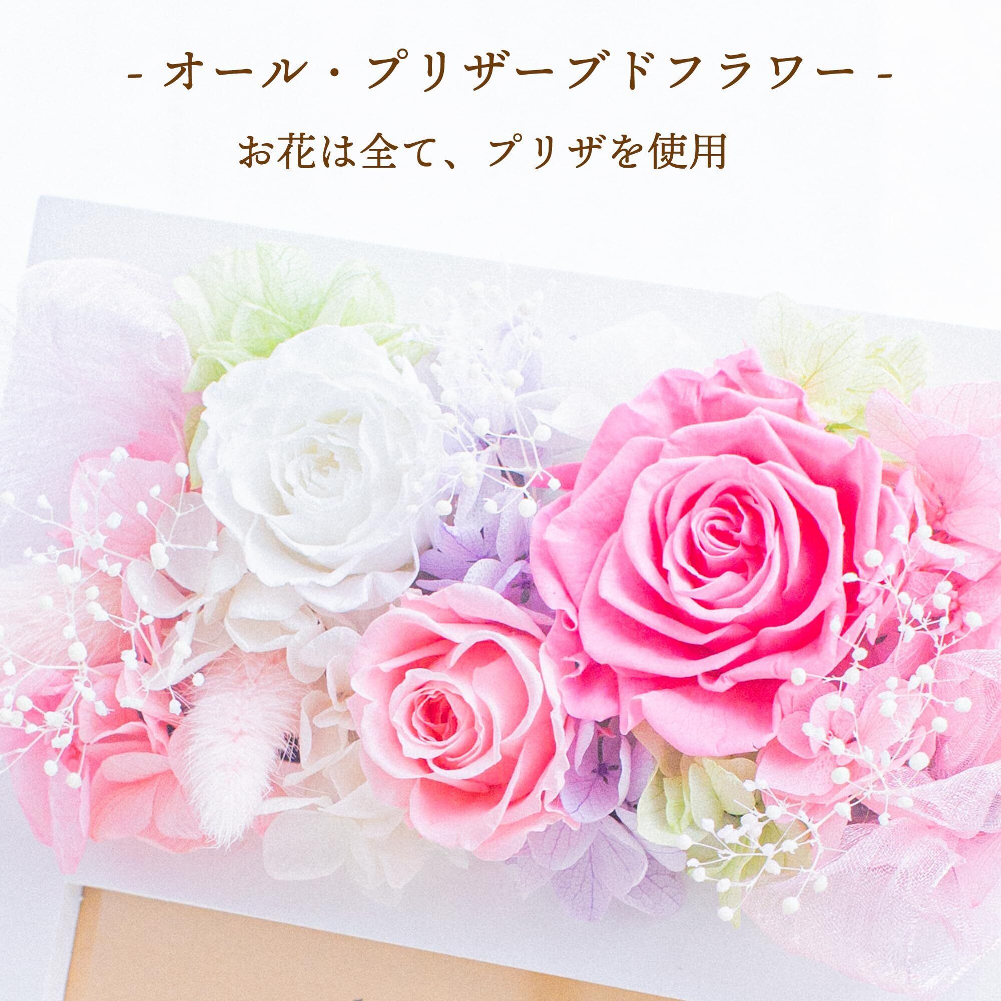 【プリザーブドフラワーとは】 水の世話がいらないので、お花を飾る週間のない方へのプレゼントにも喜ばれています。 また感染症や花粉の心配がないため、病院やクリニックへの開院祝いやお見舞いのお花にもぴったりです。 生花と違いすぐに枯れることがないので、お祝いの気持ちを長く楽しめるギフトです。