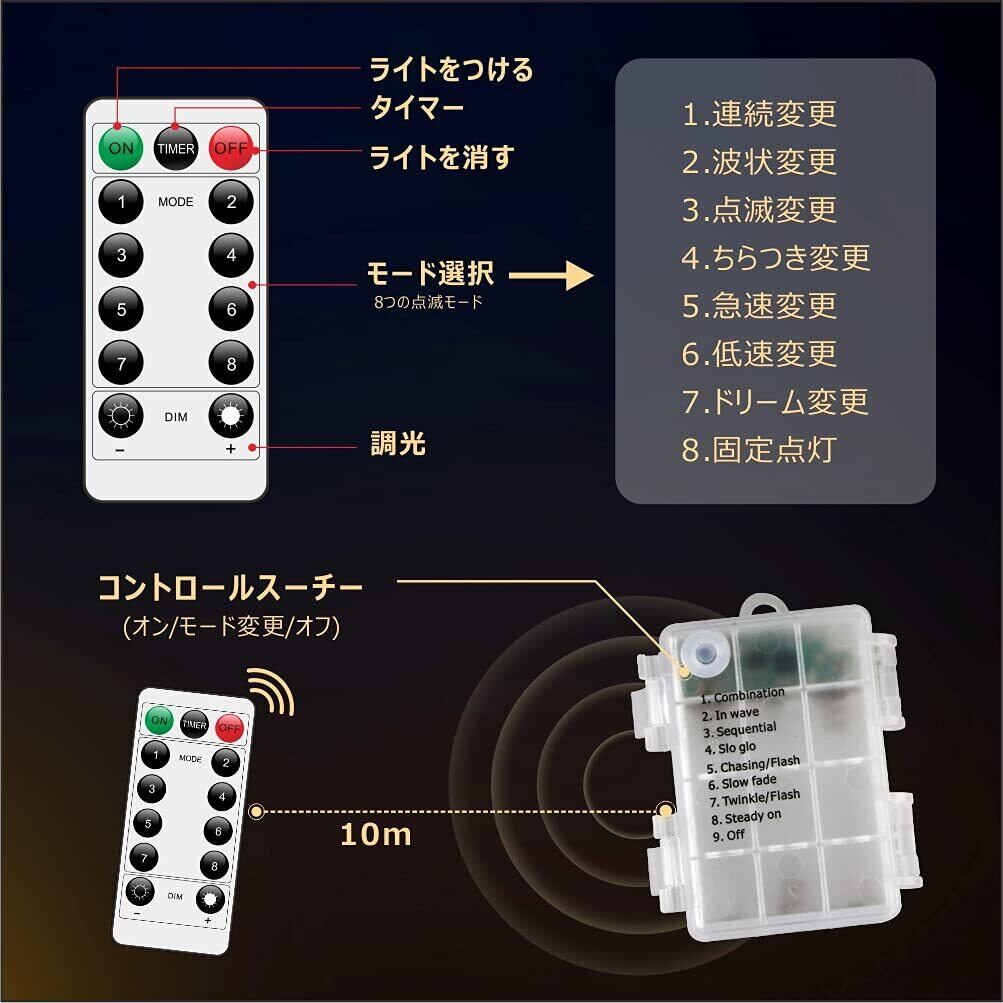 【リモコン操作・タイマー機能・電池式】電池ボックスにある電源スイッチを押してたら、付属した専用リモコンで光るパターンの切替、点灯明るさの調節、リモコン1本だけで簡単に出来上がります。点灯中、「TIMER」ボタンを押すと、6時間後自動的にオフになります。電池式なので、コンセントの場所を気にすることなく、外の何処にでも手軽に使えます! ※単三型のアルカリ乾電池3枚が必要、付属していませんので別途してください。✩【適用場所】ガーデン・玄関・庭・壁・舞台・結婚式・パーティー・披露宴などに手軽にご使用いただけます。クリスマス、新年、祭り、商店街、告白、ハウス、ホテル、バー、学校、ショッピングモールなどの装飾としても適切です。室内/室外でも大活躍、ロマンチックな雰囲気を追加出来ます。