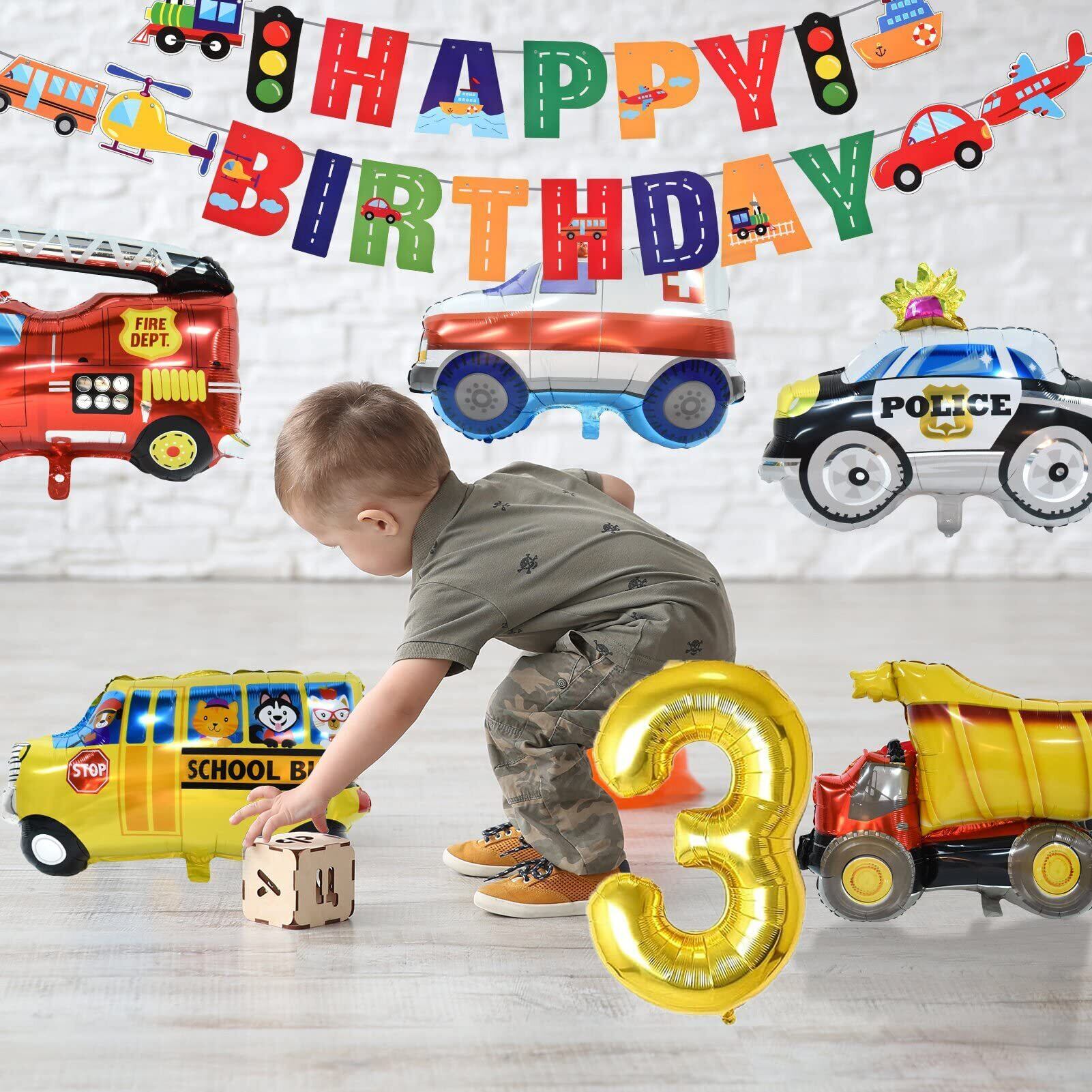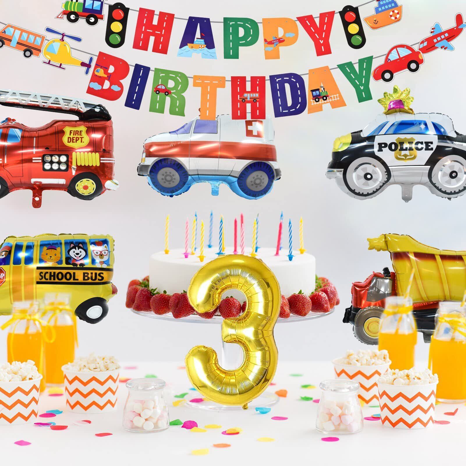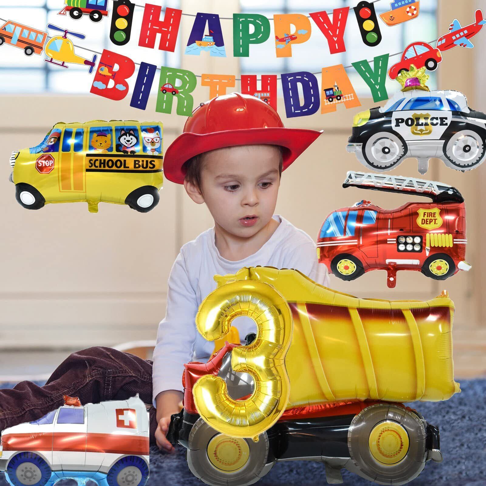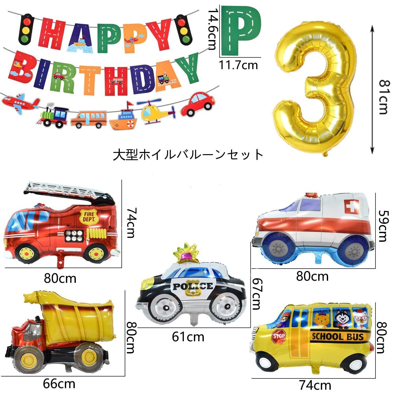 誕生日 飾り付け シンプル パーティー セット 大きな 3D車バルーンセット Happy Birthdayバースデーバナー 交通バナー パトカーアルミ風船 スクールバスアルミ風船 (数字 3)