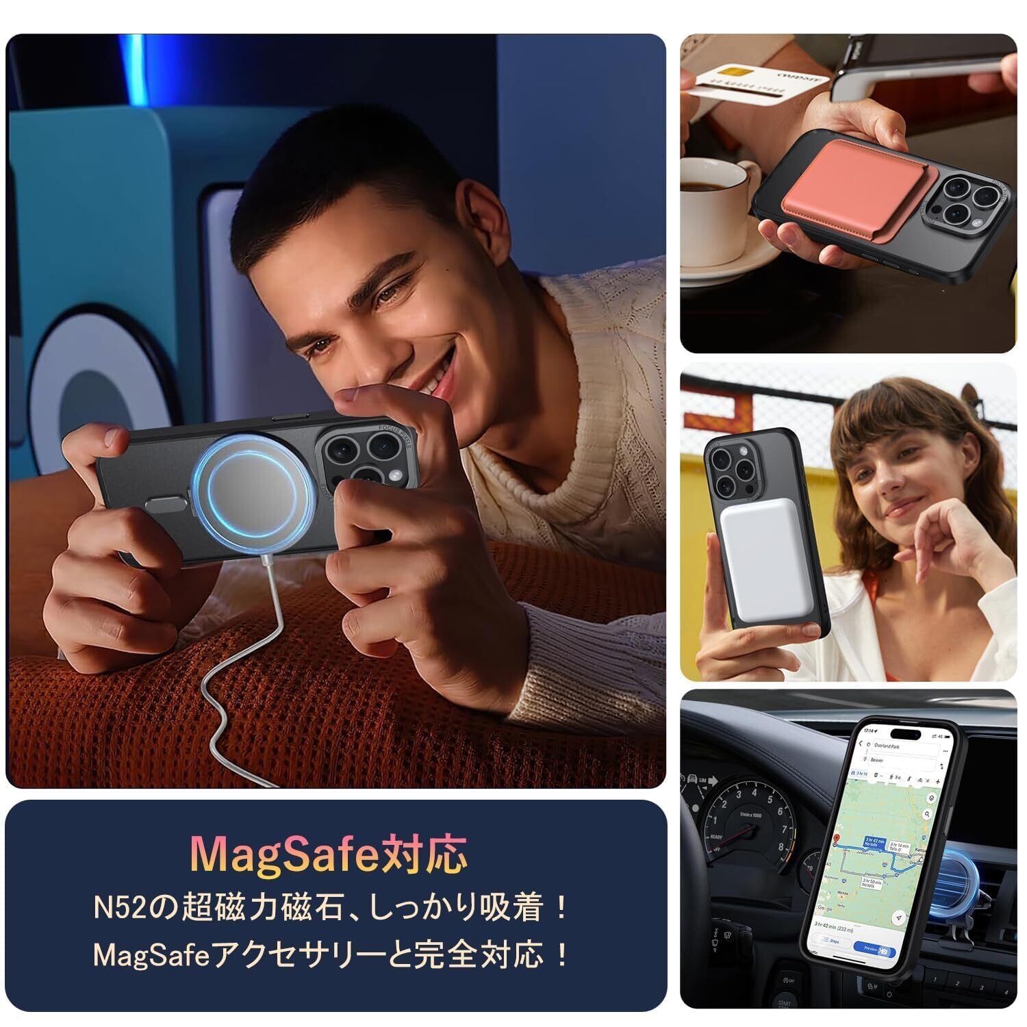 「Magsafe対応」ケースをつけたままマグセーフ機能を快適に使用できます。背面に薄くて強いマグネット内蔵しています、ワイヤレス充電や車載ホルダーやアクセサリとのあらゆる充電に安定で接着ができ、差し込みのいらないより簡単により素早く充電できます。