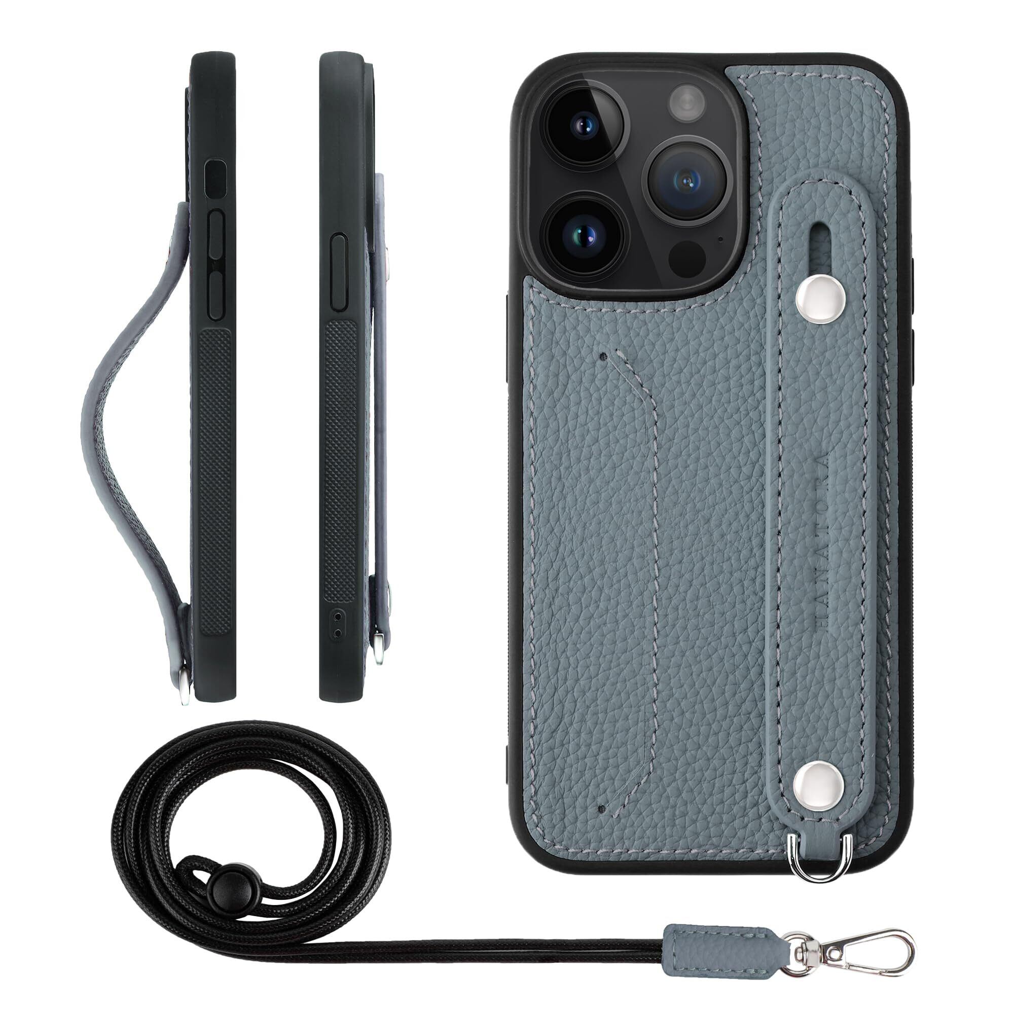 HANATORA iPhone14ProMax ケース 本革 耐衝撃 背面ベルト ストラップリング スマホケース スマホ スタンド機能 ネックストラップ 付き カードポケット シュリンクレザー ギフト ブルーグレー CGHGZ-14ProMax-BlueGray