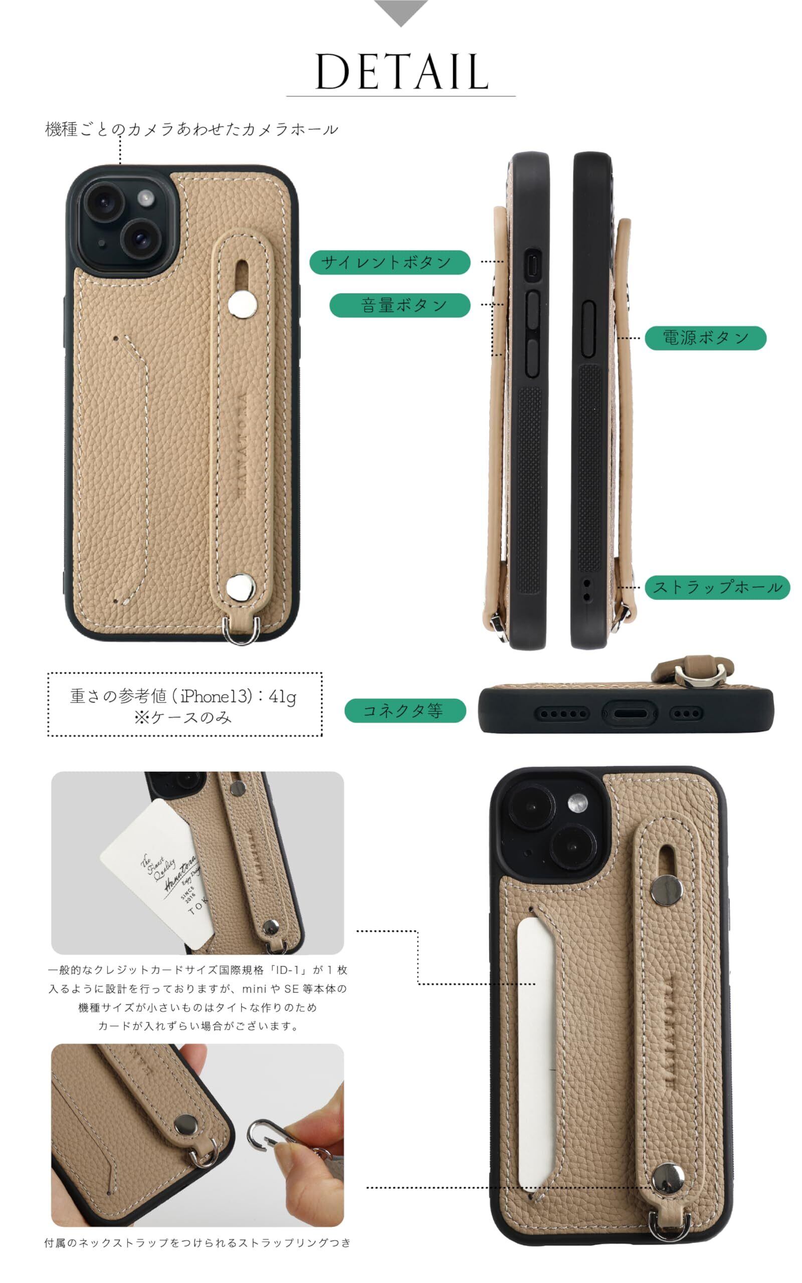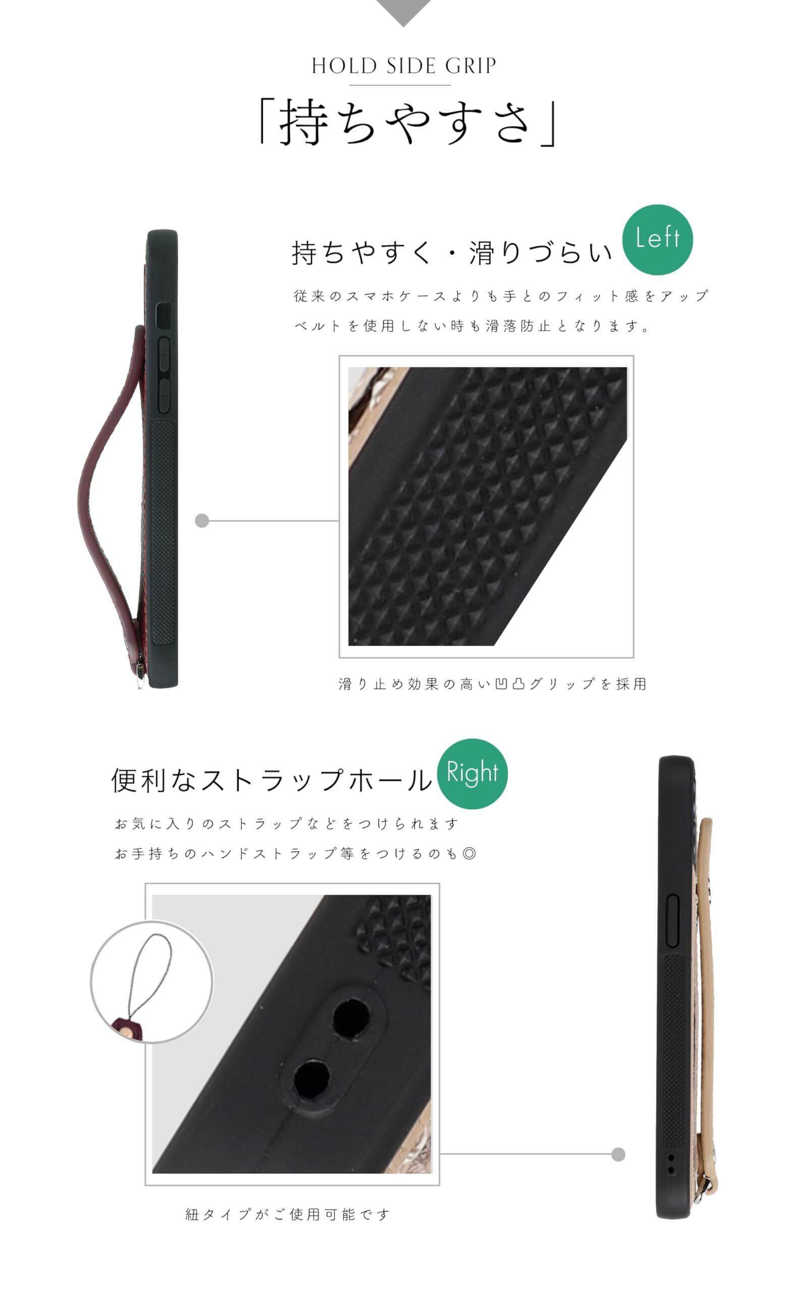 本体背面にはカード類を収納できるカードポケット付き。さらにベルトと同デザインの専用ネックストラップ付属。指を通すだけで抜群の安定感になる背面のベルトは、そのままスタンドとして使用可能。動画鑑賞は勿論のこと、スタンドとして立てておくだけで通知も分かりやすい。