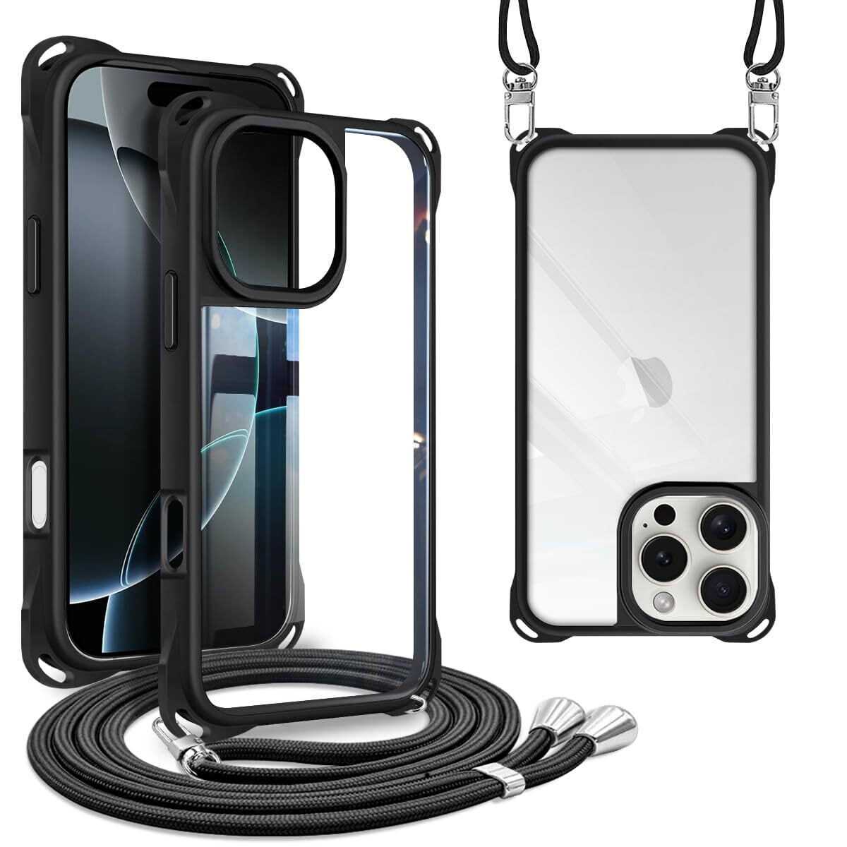 iPhone 16 Pro Max 用 ケース ショルダー 縄掛け 首掛け 肩掛け ストラップ付き 韓国 iPhone 16ProMax 用 カバー 紐付き 斜めがけ TPUバンパー 耐衝撃 薄型 軽量 黄ばみなし ハード ケース ブラック